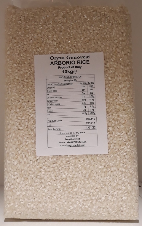 The most well known and widely used risotto rice in Italy, the large grains of the arborio rice variety cook uniformly (max. 5% grain breakage) while maintaining a pleasantly chewy centre. Oryza Genovesi arborio is 100% pure Italian arborio, not a substitute in terms of varietal or origin. It is naturally gluten free.